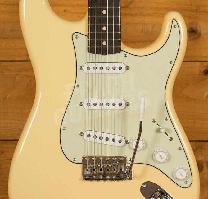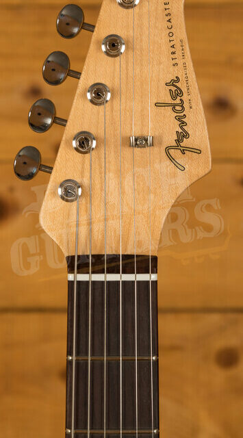 Classic appointments from the end of the decade are featured up and down the guitar: quartersawn maple neck with ’59-style ā€œDā€ back-shape and flat-laminated rosewood fingerboard bring out the best in tone and playability. Armed with a trio of Custom Shop hand-wound Fat ā€˜50s StratocasterĀ® pickups, Vintage Modified #2 wiring and Tone-Save bleed circuitry, there’s no shortage of sought after golden era tone.